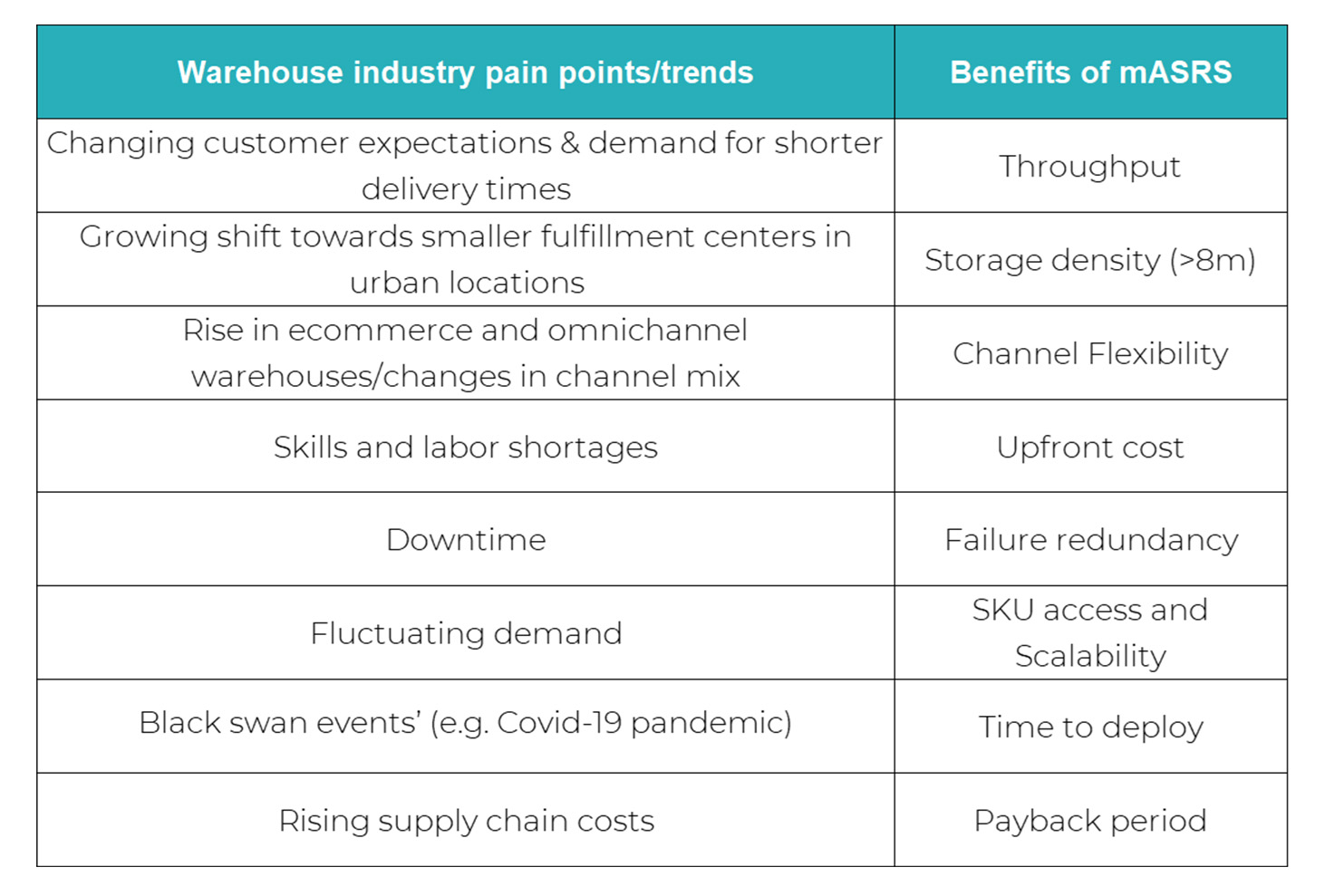 Research carried out by market intelligence specialist Interact Analysis demonstrates the key benefits of Mobile Automated Storage and Retrieval Systems (mASRS) and how they address 8 pain points and trends for warehousing. These include changes in channel mix, evolving retail habits, labor and skills shortages, and rising supply chain costs. With a maximum rack height of 12m, mASRS are designed to optimize storage and retrieval processes in the warehouse. The technology occupies a “sweet spot” in the market by balancing the competing capabilities required of warehouse automation solutions and addressing evolving industry needs (see chart below).