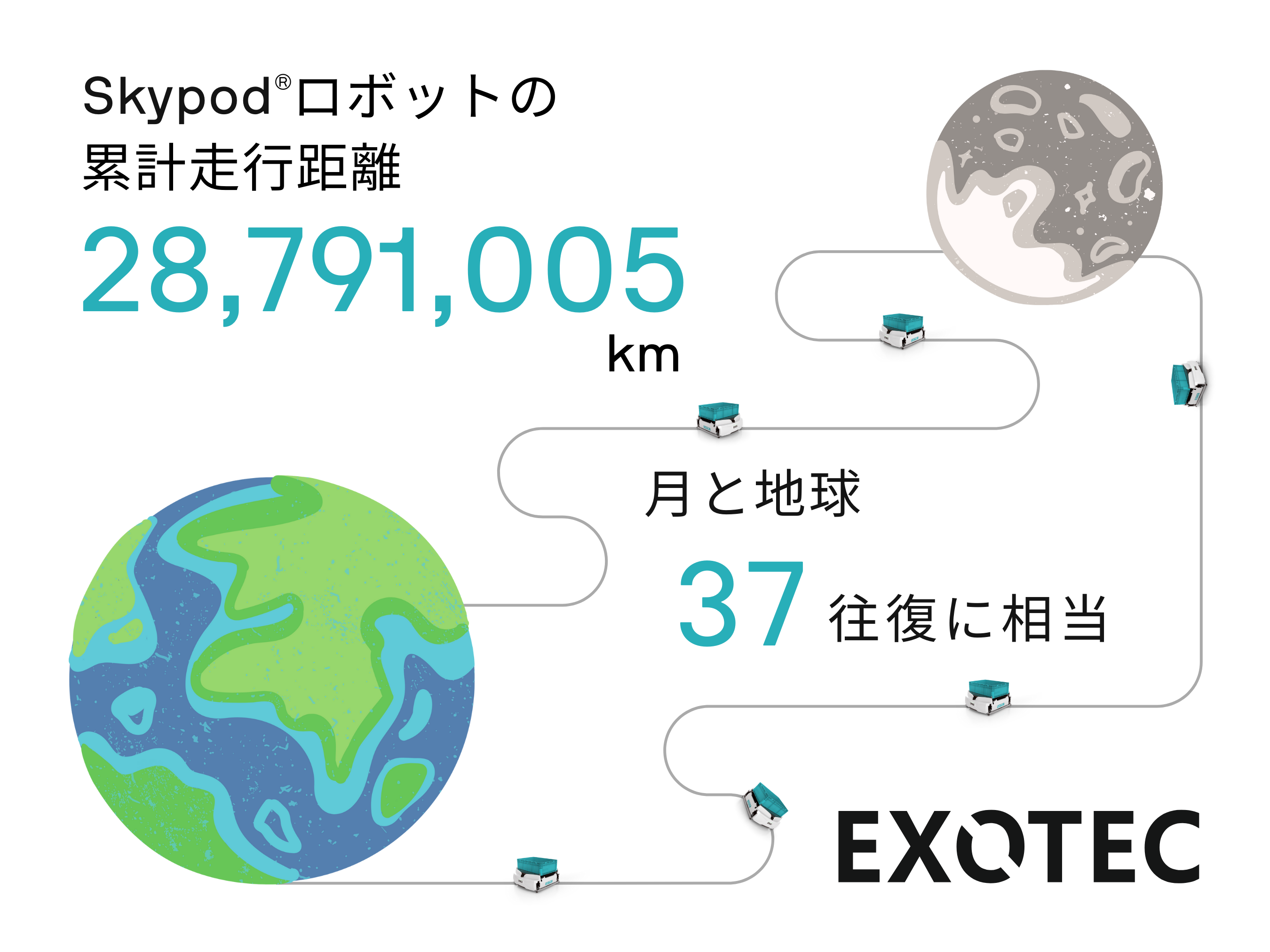 今回、Exotec®が公表した公式データによると、2017年に最初のロボットが稼働してから28,791,005 kmの距離を走行し、商材を搬送したことが明らかになりました。これは月と地球37往復分の距離に相当します。Skypod®は、最も走行距離の長いサイトで500万km以上走行しており、走行距離上位10位までの拠点の平均走行距離は175万kmとなっています。